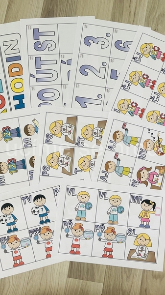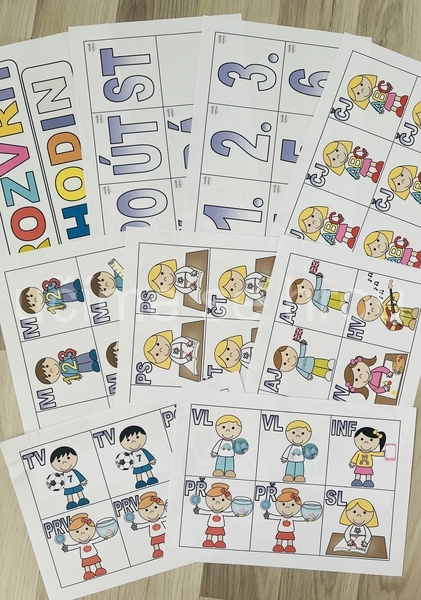 Hotový výrobek: obsahuje nadpis, zkratky dnů, hodiny 1. - 6., 32 karet s předměty: 9 x ČJ, 3 x AJ, 5 x M, 1 x M (geometrie), 3 x PRV, 2 x VL, 2 x PŘ, 2 x TV, 2 x VV, 1 x HV, 1 x INF, 1 x PČ - využitelné od 1. do 5. třídy